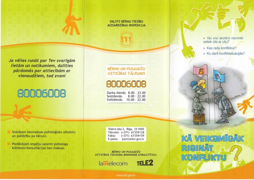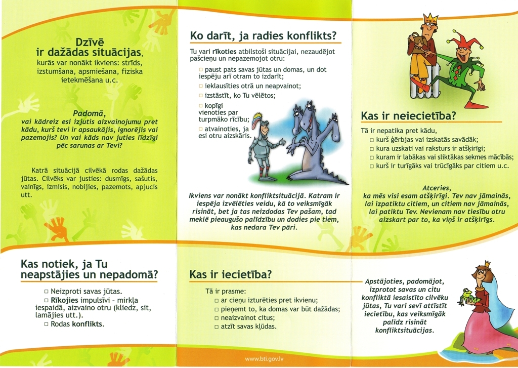 Informatīvajā bukletā "Kā veiksmīgāk risināt konfliktu? " iekļauti praktiski padomi un ieteikumi bērniem, kas būs noderīgi gadījumos, ja radusies konfliktsituācija.