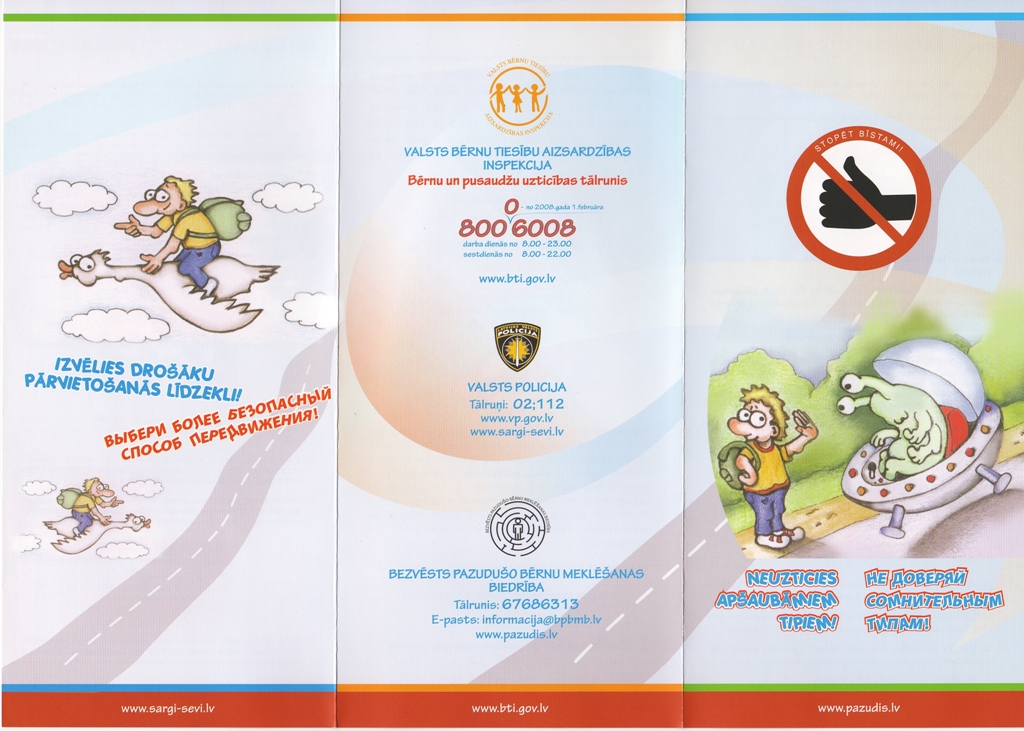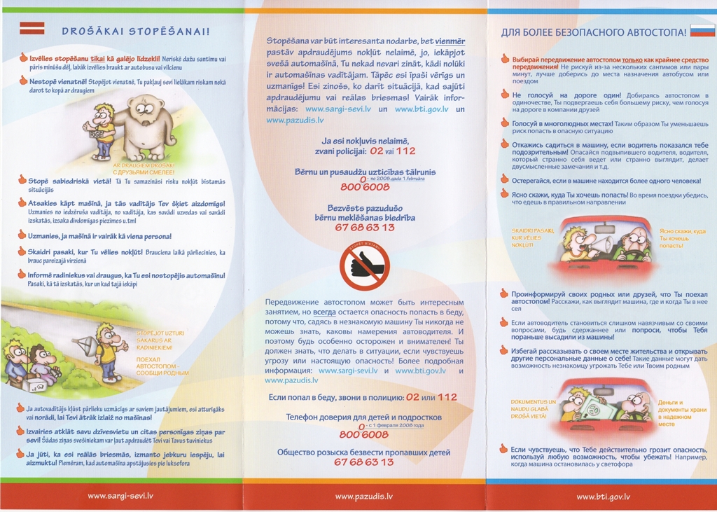Informatīvajā bukletā „Stopēt bīstami” iekļauti praktiski padomi bērniem, kas būs noderīgi gadījumos, kad viņi nolēmuši doties uz ceļa lai stopētu.
