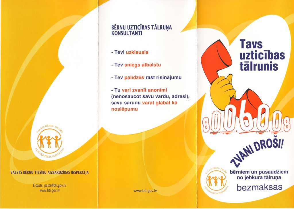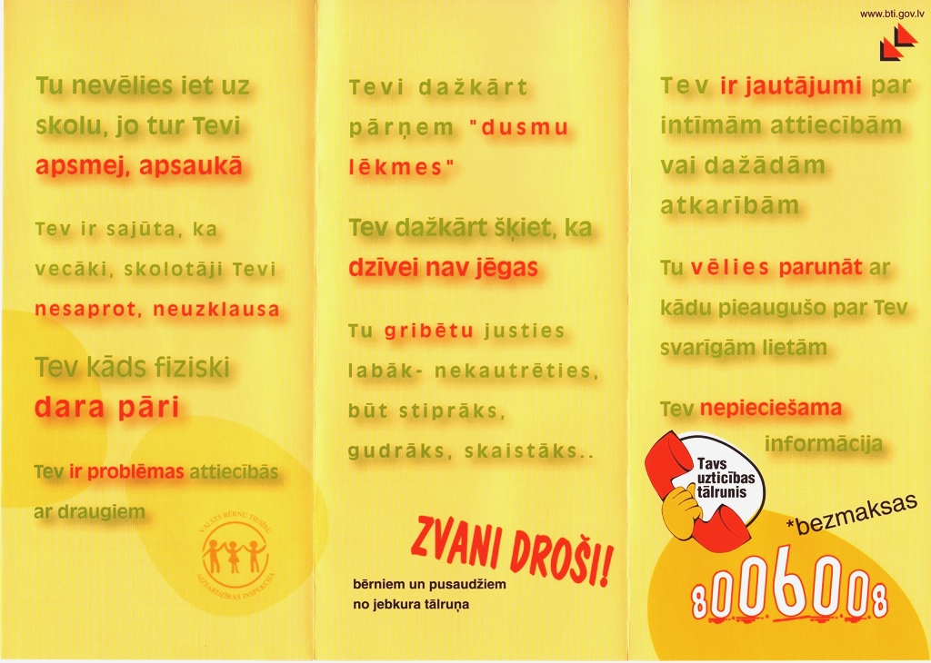 Bukletā pusaudži var iegūt informāciju par bērnu un pusaudžu bezmaksas uzticības tālruni 8006008.